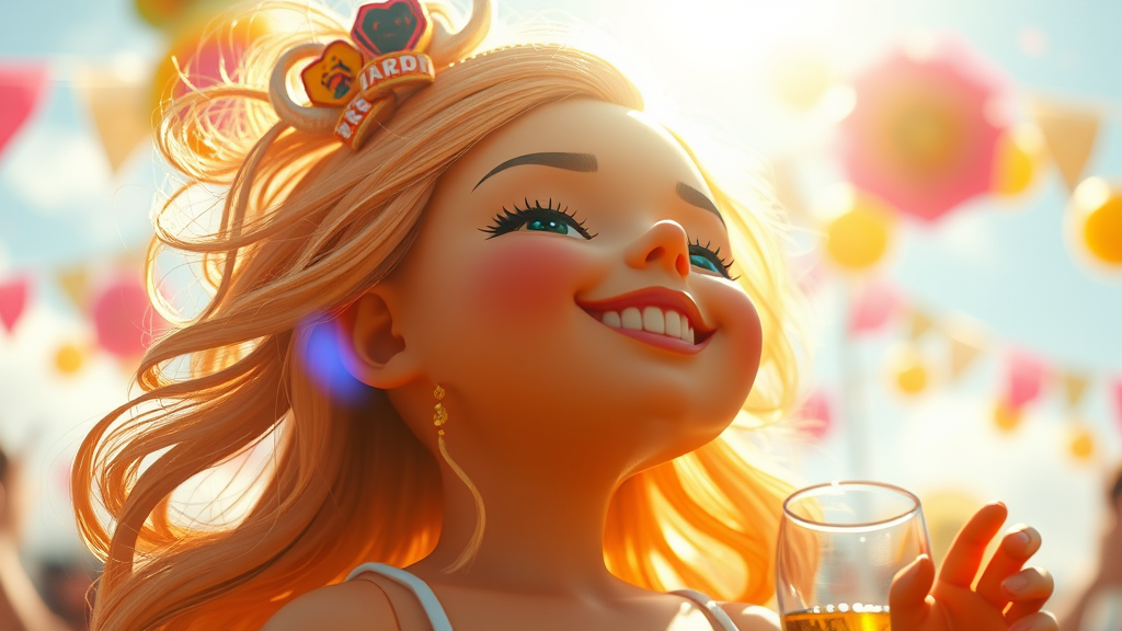 The viewer is instantly captivated, drawn into a vibrant realm bursting with joy and exuberance. Each element within the image radiates its own dazzling light, creating an atmosphere alive with laughter and the clinking of glass. The sensation of sunlit warmth on one's skin and a gentle breeze tousling the hair is almost palpable. This imaginative masterpiece serves as a beacon of inspiration, leaving one in awe of its enchanting beauty and unique creativity. cgi, 3d, doll, octane, render, pixelated, noisy, faded, jpeg traces, unattractive, repetitive, eerie, mishap, cropped, confused fingers, distorted hands, inaccurately drawn hands, awkwardly drawn face, anomaly, disfigured, fuzzy, parched, inaccurate anatomy, mismatched proportions, surplus limbs, repeated face, misshapen, awkward proportions, distorted limbs, absent arms, absent legs, redundant arms, redundant legs, merged fingers, excessive fingers, elongated neck.