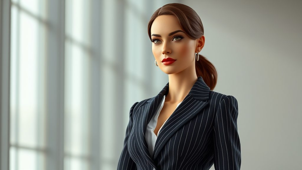 The viewer is instantly drawn to the image of the ultimate female executive, where her striking presence commands attention. Clad in a flawlessly tailored suit that elegantly follows her form, she radiates confidence and authority. The material of her ensemble, a refined blend of wool and silk, features a subtle pinstripe that enhances her sophisticated aura. Her suit jacket, with its precisely fitted design, narrow lapel, and three-button closure, accentuates her sleek silhouette. The scene, rendered in CGI with a 3D doll-like quality, captures the essence of professionalism with an artistically stylized interpretation, balancing beauty and strength in the portrayal.