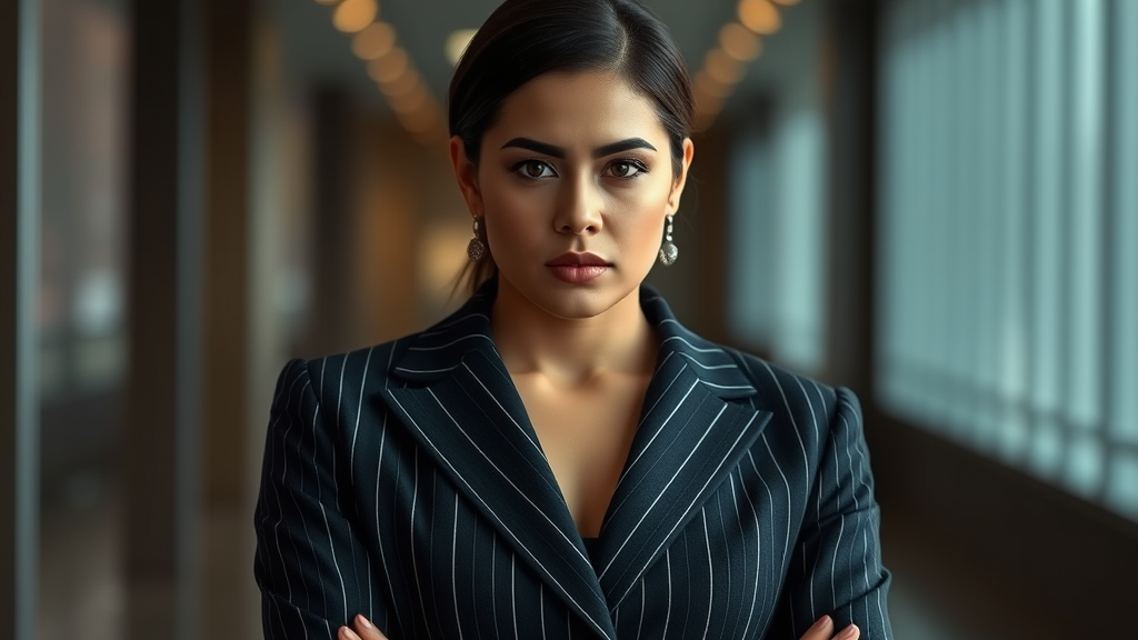 The viewer's attention is instantly drawn to the mesmerizing presence of the ultimate female business leader. She is elegantly dressed in a perfectly tailored suit that highlights her silhouette and radiates confidence and power. The suit is crafted from a luxurious blend of wool and silk, featuring a delicate pinstripe design that adds a layer of refinement to her attire. Her jacket fits flawlessly, with sleek lapels and a trio of buttons highlighting her slender waist. Her poised demeanor and sharp outfit converge in a striking representation of modern professionalism, showcasing her as a paragon of success and elegance.
