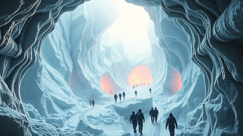The wind chimes of yesteryears resonated softly in the dense overcast afternoon, a luminous aura emanating from my ears, buzzing like distant glaciers accelerating towards me. A network of intertwining tunnels beneath Antarctica echoed under frail ice sheets, bustling with figures navigating the passages, mesmerizing and majestic, vibrant fantasy digital art, with octane render.