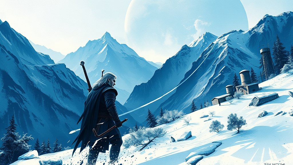 The Witcher-inspired wallpaper, featuring a dynamic scene in brushwork exploration style, painted in light blue and indigo hues with expressive figure painting of a lone warrior. The backdrop showcases sweeping mountainous vistas and serene snow scenes, interwoven with elements of industrial artistry. The depiction captures a sense of motion and depth, inviting the viewer into a close-up exploration of the world comprised of both nature and human ingenuity.