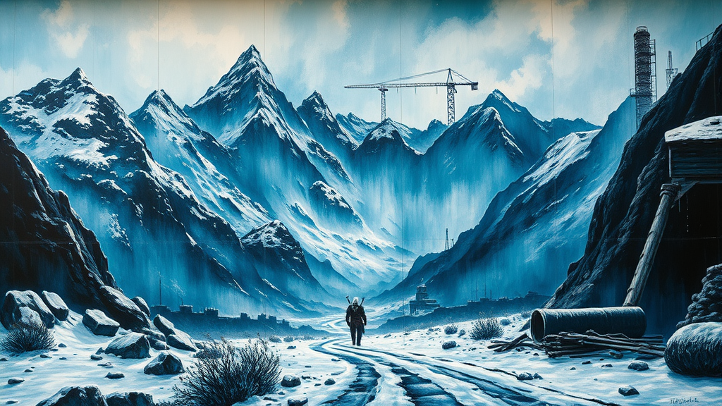 The Witcher mural, in the style of dynamic brushwork, light azure and deep indigo, emotive figure painting, rugged mountain vistas, wintry landscapes, industrial scenes, detailed close-ups, capturing the essence of epic fantasy, ethereal atmosphere, intricate textures, subtle contrasts, evocative and atmospheric composition.