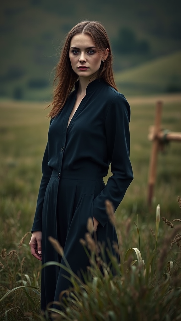 The woman in the field stands poised, her attire meticulously styled for the lens, capturing the essence of Daria Endresen’s ethereal touch and Kris Knight’s gentle intimacy against a backdrop of lush Scottish landscapes. Her clothing blends light navy and rich dark brown tones, echoing the sophistication of Georg Jensen designs. The photo features intense close-ups, highlighting the matte finish that softens the drama of her expression, perfectly blending nature with nuanced elegance in an immersive portrait ratio.