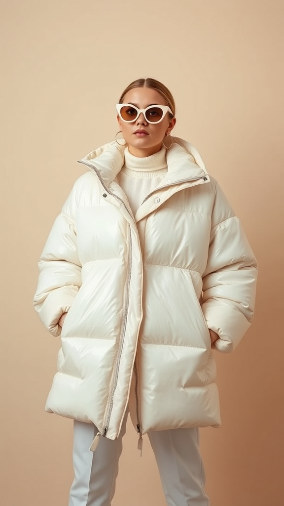 The woman in the image poses against a soft, beige backdrop, exuding the essence of a Tumblr icon. She sports a glossy puffer jacket paired with a chic poncho, both in a sleek, off-white palette. This bold ensemble may nod to a viral internet meme or trend, currently making waves on the design and architecture platform Dezeen. The image resembles a fashion catalog entry, highlighting the cutting-edge trends predicted for 2024. Featured accessories include a stylish mac, a pair of 8.0 LV sunglasses, and a unique folded piece by designers Mike and Wojtek Fus. This outfit captures the forward-thinking fashion of the year, guaranteed to capture attention.