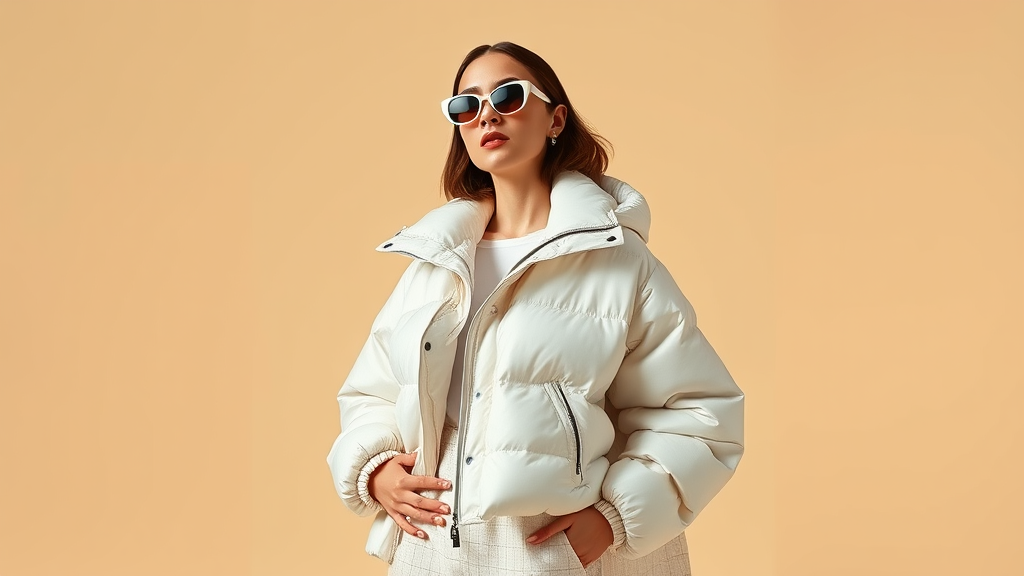 The woman in the image poses confidently against a neutral beige backdrop, embodying the essence of a Tumblr icon. Her avant-garde outfit features a reflective puffer jacket layered with a chic poncho, both in a sophisticated off-white palette. This fashion statement nods to an emerging internet meme or trend and is currently making waves on the design and architecture hub, Dezeen. The photo seems to be part of a 2024 fashion catalog, presenting the forefront of style for the year. Accessories enhancing the look include a sleek mac, striking 8.0 LV sunglasses, and a unique folded piece designed by the creative duo Mike and Wojtek Fus. This ensemble epitomizes the forward-thinking fashion of the year, guaranteed to capture attention and admiration.