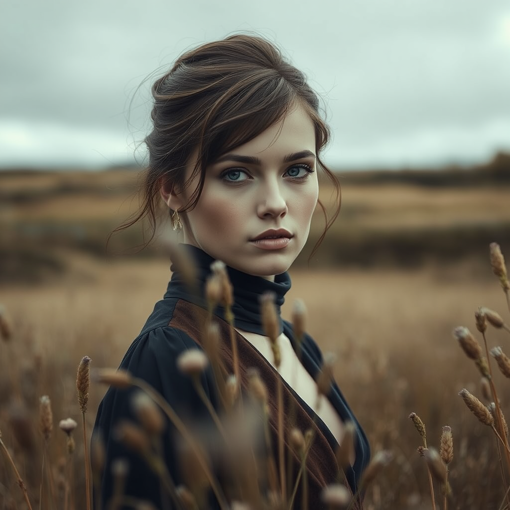 The woman in the meadow is elegantly posed for the lens, embodying the styles of Daria Endresen and Kris Knight amid Scottish landscapes, her attire blending shades of deep navy and rich brown. The aesthetic echoes the design elements of Georg Jensen, featuring intense close-ups with a matte finish. The scene captures an atmosphere of serene allure, framed in an aspect ratio of 132:161, with a subtle softness that evokes a dreamlike quality.
