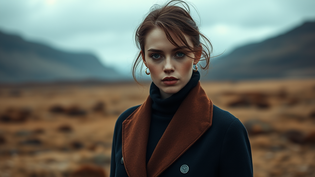 The woman in the vast Scottish landscape stands poised, her attire harmonizing with the camera's gaze, reminiscent of the styles of Daria Endresen and Kris Knight. Her ensemble features tones of muted navy and deep brown, capturing the elegance of Georg Jensen's aesthetic. The scene is an intense close-up, where the matte finish of the photo accentuates her presence, blending seamlessly with the natural backdrop. The composition is artistically styled, invoking a surreal yet captivating beauty within the serene and rugged terrain.