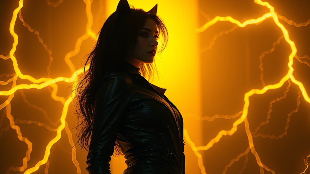 The woman is adorned in a futuristic black leather suit, embodying a style reminiscent of animated gifs fused with soft-focused realism. Her silhouette glows with a splattered and dripped aesthetic under a radiant golden light. Surrounding her are dynamic lightning waves, infusing the scene with energy. Elements of catcore are interwoven with neo-Victorian influences, crafting a unique juxtaposition of eras. The overall composition radiates an ethereal yet cutting-edge allure.
