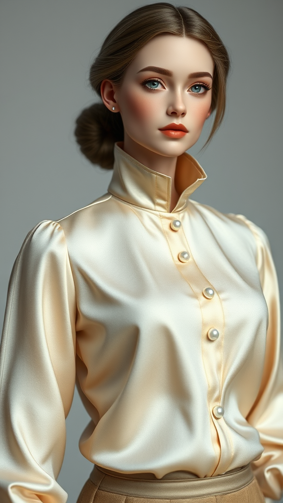 The woman's blouse is crafted from a luxurious, creamy silk that cascades gracefully over her figure. Its sophisticated high collar perfectly accents her facial features, while the sleeves are finished with exquisite pearl buttons that enhance the ensemble's elegance. cgi, 3d, doll, octane, render, intricate texture, slight imperfections, artistic blur, charmingly unique, imaginative proportions, creatively altered, harmoniously structured, subtly abstract, elegantly distorted, thoughtfully conceived, surprising elements, intriguing anatomy, unusually composed.