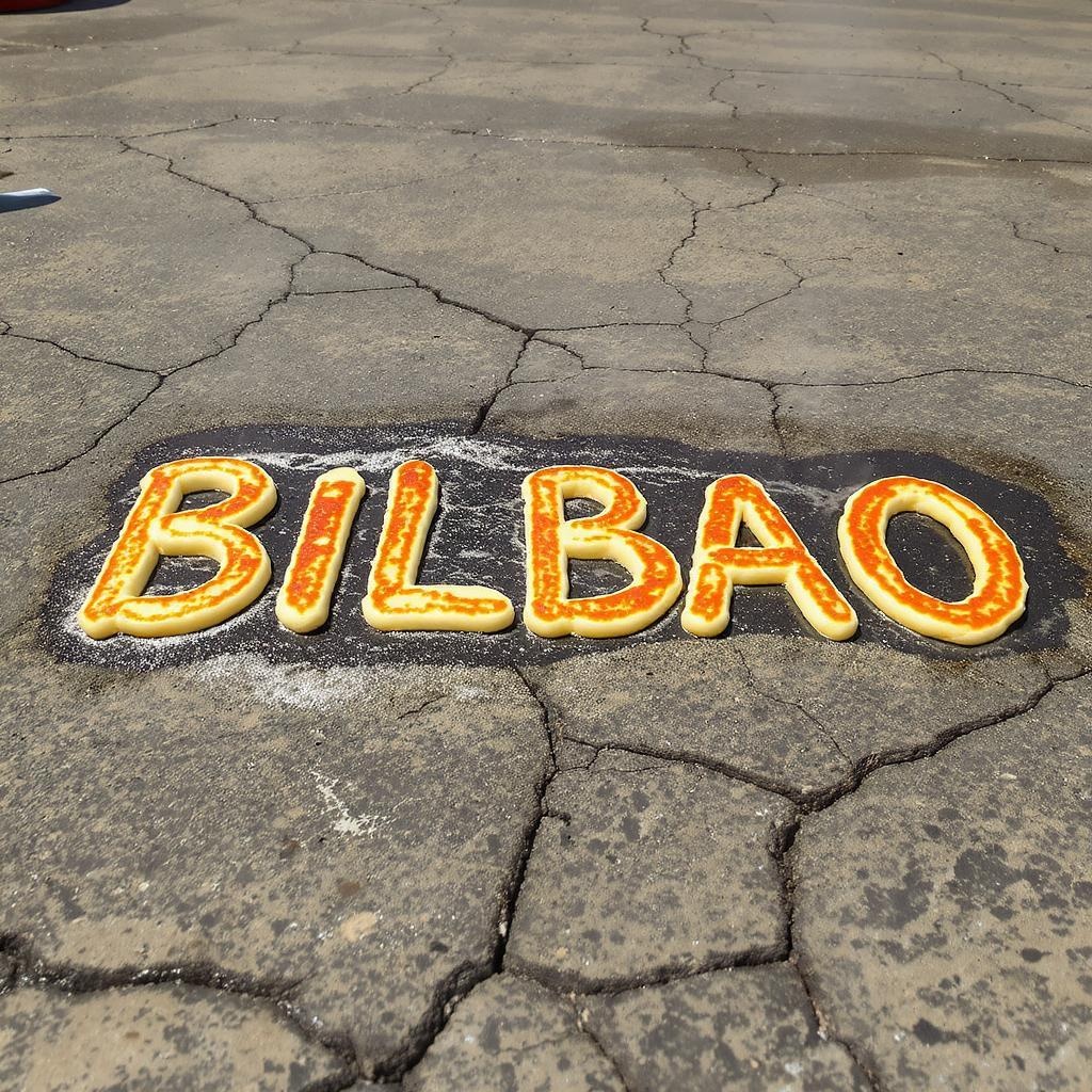 The word "BILBAO" formed by sizzling pancakes cooking on the sun-baked pavement, each letter a golden brown delight under the summer heat.