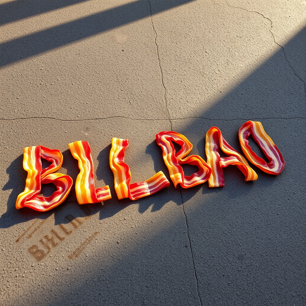 The word "BILBAO" formed by sizzling strips of bacon on the sun-baked pavement, each letter crisply defined by the heat rising from the scorching street surface.