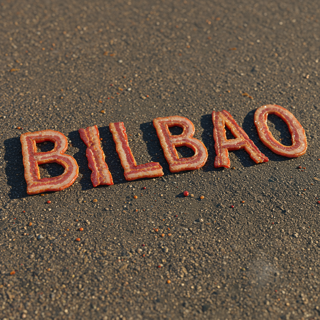 The word "BILBAO" formed by sizzling strips of bacon, frying on the scorching summer pavement.