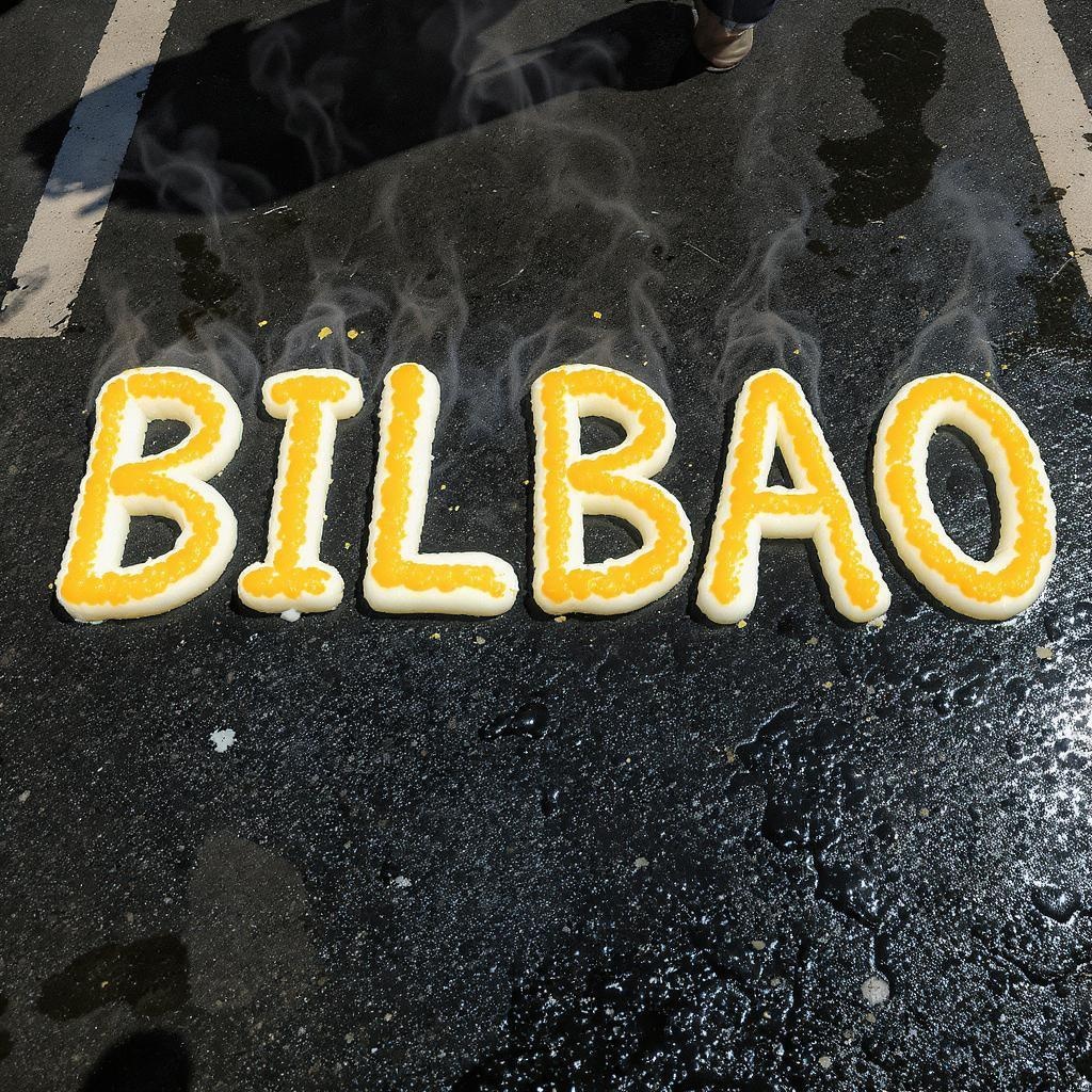 The word "BILBAO" sizzles on the scorching summer pavement, each letter crafted from perfectly fried eggs, their edges crispy and golden against the dark, hot surface.
