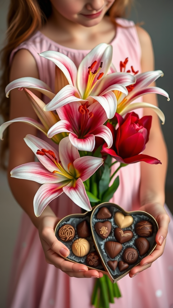 The young girl gracefully carries a bouquet of fragrant lilies, their petals silky smooth and their hues ranging from soft ivory to rich burgundy. In her other hand, she cradles a heart-shaped tin of artisanal chocolates, each piece elegantly crafted with unique designs and bursting with luxurious flavors that dissolve blissfully on the palate.
