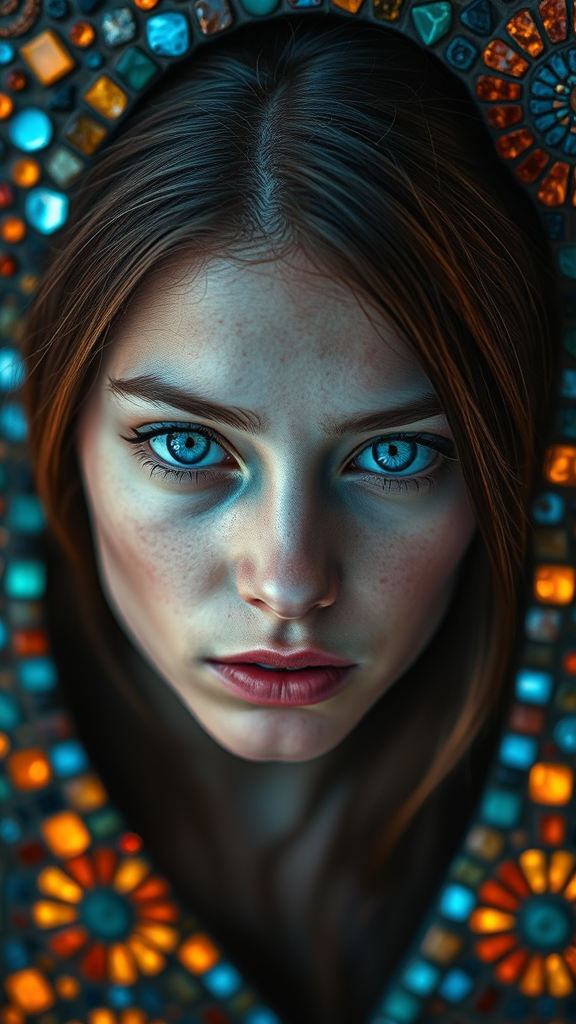 The young woman possesses captivating azure eyes, surrounded by an array of intricately detailed mosaic tiles, which are vibrant and full of life. With an awe-inspiring cinematic quality, the scene exudes a dramatic atmosphere. The composition is highly coherent, exhibiting a sharpness that enhances the complexity and glow of each tile. The overall effect is stunning and striking, with amazing symmetry and profound thought woven into the mosaic design. Rich and surreal, the elaborate setting feels both epic and finely crafted. The vibrant and dynamic ambiance is fantastically iconic, with deep, immersive colors that create an artistic and professional impression.