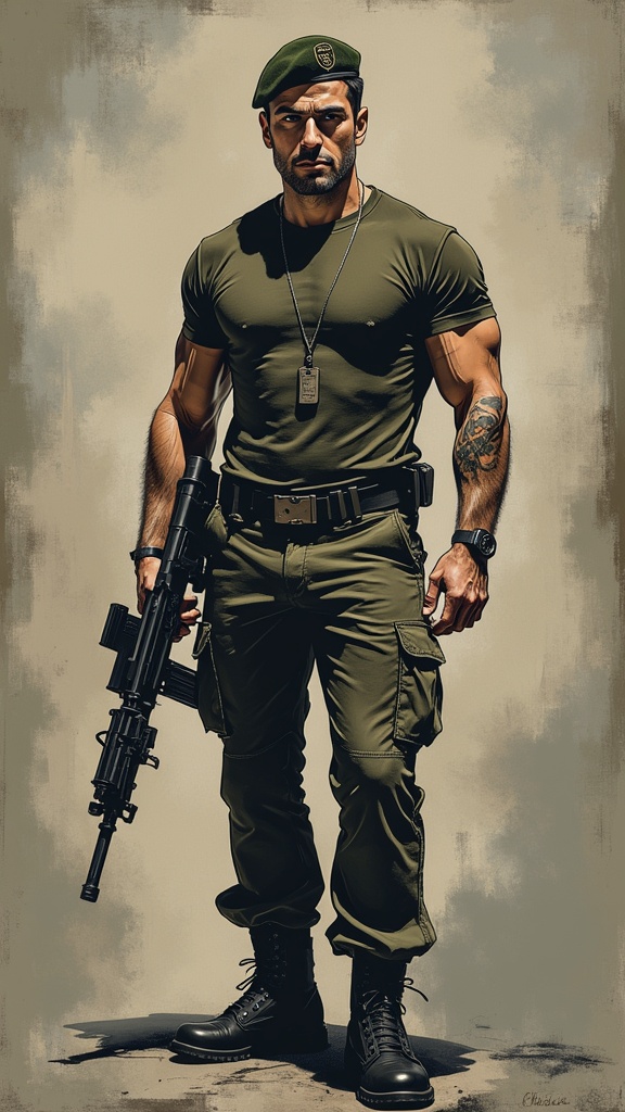 They call him "Sgt.Hawk" because he can fly ANY helicopter, especially the Black Hawk helicopter--he's the best. Sargeant in the U.S. army, military guy, hypermasculine male, mature man. Caucasian male, light brown hair, light brown eyes, focused gaze. Strong brow, strong chiseled chin, clean shaven hairless face. Wears green military beret. Tall, strong, muscular, sinewy, broad chest, athletic build. Minimum body hair on chest and arms, very hairy armpits. Tight, army green T-shirt, silver dog tags around neck. Black Hawk tattoo on right arm. Green fatigue pants, black tactical belt. Black combat boots. Full body relaxed pose, holding a recently fired machine gun. He is very clean cut, a model army poster guy.