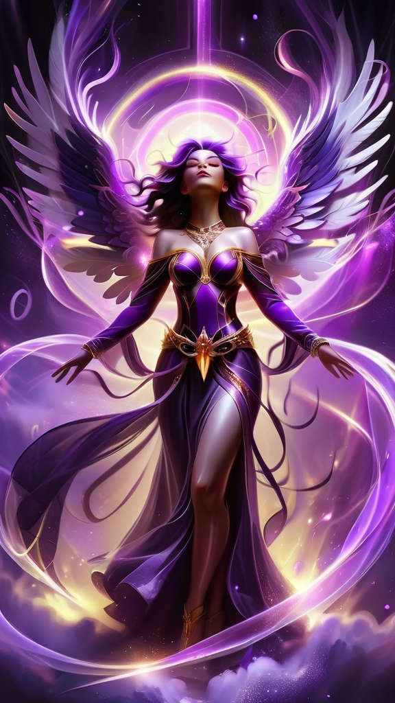 They say that purple stars don't exist in space, or that we can't see the light they emit...but they do, and there is an Angel that resides over them. She is a beautiful Angel with huge wings with Violet, purple, magenta, amethyst, lilac and magenta wings. She appears as a feminine Caucasian woman-- tall, statuesque, strong, slender but athletic. Her hair is black with streaks of purple throughout, swept back on one side, curly Bangs swept to one side with long loose curls falling over her shoulders. Her eyes are bright Violet and shine like jewels, her lips magenta, her face modelesque and pretty. There is a glowing bright Violet halo over her head. She wears a shiny metallic long sleeved off the shoulder gown, the sleeves lacey and delicate. She wears a gold necklace around her neck with an amethyst stone pendant. Gold bracelets on her wrists, and a metallic gold belt with amethyst stones around her waist. The bottom part of her gown is flowing gently, she wears golden high heeled sandals on her feet. She stands on the edge of a galaxy, and there are purple stars where she resides. She carries a golden jeweled sword that vanquishes evil and darkness. She is God's Angel of mystery and all things unkown. Full body pose. They say that purple stars don't exist, but SHE DOES...