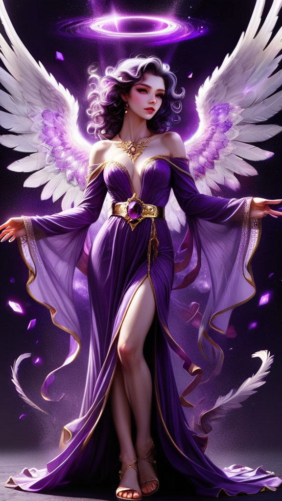They say that purple stars don't exist in space, or that we can't see the light they emit...but they do, and there is an Angel that resides over them. She is a beautiful Angel with huge wings with Violet, purple, magenta, amethyst, lilac and magenta wings. She appears as a feminine Caucasian woman-- tall, statuesque, strong, slender but athletic. Her hair is black with streaks of purple throughout, swept back on one side, curly Bangs swept to one side with long loose curls falling over her shoulders. Her eyes are bright Violet and shine like jewels, her lips magenta, her face modelesque and pretty. There is a glowing bright Violet halo over her head. She wears a shiny metallic long sleeved off the shoulder gown, the sleeves lacey and delicate. She wears a gold necklace around her neck with an amethyst stone pendant. Gold bracelets on her wrists, and a metallic gold belt with amethyst stones around her waist. The bottom part of her gown is flowing gently, she wears golden high heeled sandals on her feet. She stands on the edge of a galaxy, and there are purple stars where she resides. She carries a golden jeweled sword that vanquishes evil and darkness. She is God's Angel of mystery and all things unkown. Full body pose. They say that purple stars don't exist, but SHE DOES...