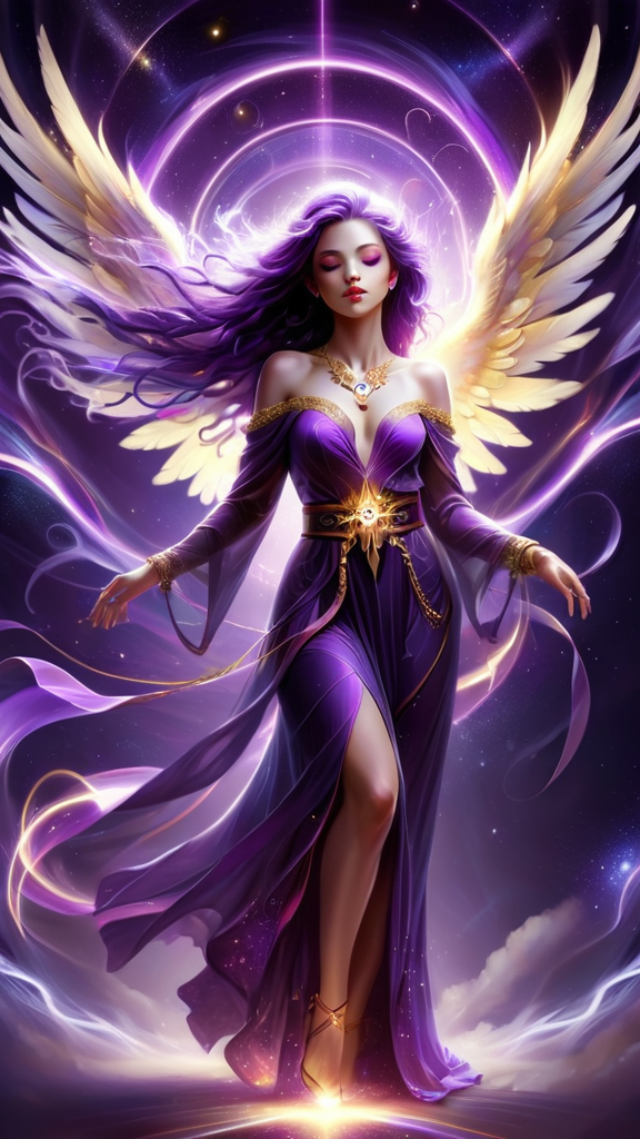 They say that purple stars don't exist in space, or that we can't see the light they emit...but they do, and there is an Angel that resides over them. She is a beautiful Angel with huge wings with Violet, purple, magenta, amethyst, lilac and magenta wings. She appears as a feminine Caucasian woman-- tall, statuesque, strong, slender but athletic. Her hair is black with streaks of purple throughout, swept back on one side, curly Bangs swept to one side with long loose curls falling over her shoulders. Her eyes are bright Violet and shine like jewels, her lips magenta, her face modelesque and pretty. There is a glowing bright Violet halo over her head. She wears a shiny metallic long sleeved off the shoulder gown, the sleeves lacey and delicate. She wears a gold necklace around her neck with an amethyst stone pendant. Gold bracelets on her wrists, and a metallic gold belt with amethyst stones around her waist. The bottom part of her gown is flowing gently, she wears golden high heeled sandals on her feet. She stands on the edge of a galaxy, and there are purple stars where she resides. She carries a golden jeweled sword that vanquishes evil and darkness. She is God's Angel of mystery and all things unkown. Full body pose. They say that purple stars don't exist, but SHE DOES...