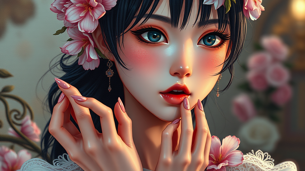Thick acrylic illustration, beautiful anime girl, oil painting, vibrant iridescent reflection, floral embellishments, chiaroscuro, divine cinematic rim lighting, rococo-inspired CGI, 3D, doll-like, octane render. Low resolution, text errors, cropping, poor quality, noticeable JPEG artifacts, unattractive, duplicates, unsettling, distorted, out-of-frame elements, incorrect finger count, misshapen hands, poorly drawn facial features, mutations, blurred, disproportionate anatomy, extra limbs, cloned facial features, distorted proportions, malformed limbs, missing appendages, fused fingers, overly elongated neck.
