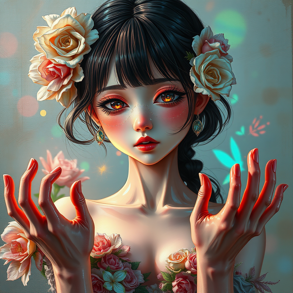 Thick acrylic illustration, enchanting anime girl, oil painting style, vivid iridescent reflections, floral embellishments, dramatic chiaroscuro lighting, divine cinematic rim lighting, rococo art inspiration, CGI, 3D rendering, doll-like appearance, octane render effects, low-resolution with text errors, cropped elements, intentionally poor quality with JPEG artifacts, distorted and duplicate features, unsettling and morbid aspects, mutilated body with parts out of frame, extra fingers, misshapen hands, poorly drawn expressions, unnatural mutations, blurry details, dehydrated look, flawed anatomy, disproportionate forms, additional and missing limbs, cloned faces, disfigured and grossly formed aspects, malformed structures, excessive appendages, fused fingers, elongated neck.