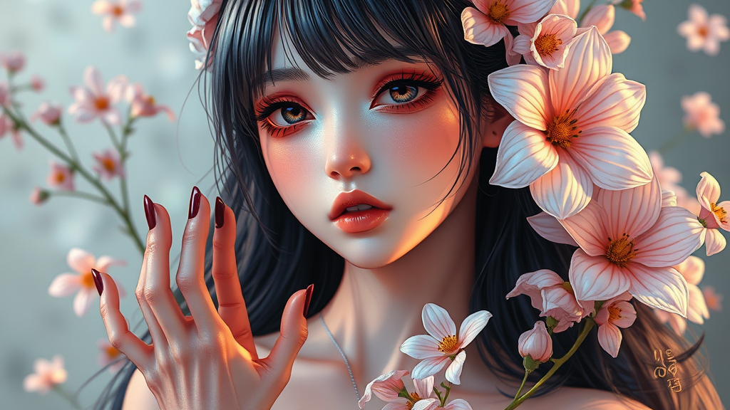 Thick acrylic illustration of a stunning anime girl, inspired by oil painting techniques, featuring extreme iridescent reflections and delicate flower decorations. The composition is enhanced with chiaroscuro, holy cinematic rim lighting, and a touch of rococo art style. The image embodies a 3D doll-like quality with a modern CGI render aesthetic, captured in an octane lighting setup. However, the overall quality is intentionally compromised, showcasing low resolution with visible text and errors. The image appears cropped and exhibits artifacts like JPEG compression, emphasizing a theme of imperfection through duplicated elements, odd proportions, and unconventional anatomy, including extra and mutated limbs and digits, with a disfigured facial structure. These elements converge into a morbid yet fascinating portrayal, embracing blurry and dehydrated features in combination with grossly intriguing malformed limbs, fused and surplus fingers, and an exaggerated neck length.
