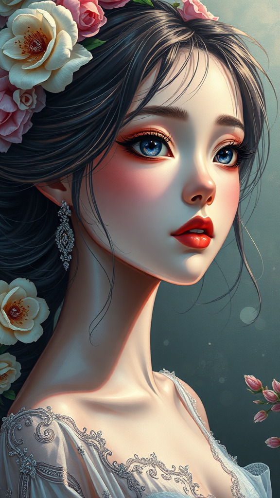 Thick acrylic illustration of a stunning anime girl in the style of an oil painting, featuring striking iridescent reflections and ornate flower decorations. The piece employs chiaroscuro techniques and holy cinematic rim lighting, inspired by rococo art. It captures a 3D doll-like essence, rendered with octane precision. Despite being low in resolution and quality, the image intentionally includes text errors, cropped elements, jpeg artifacts, and displays a sense of duplication, complemented by abstract morphologies—such as extra limbs, elongated neck, and fused fingers—to emphasize artistic chaos and surrealism. The resulting image is a blend of both beauty and distortion, featuring vivid storytelling through its imperfections and unique character representation.