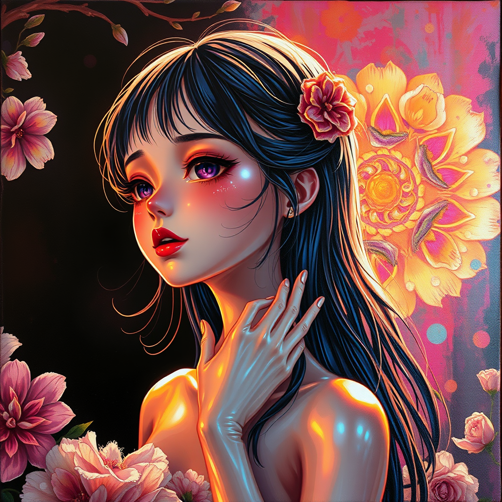 Thick acrylic illustration, radiant anime girl, oil painting, vibrant iridescent reflection, floral accents, chiaroscuro, divine cinematic rim lighting, rococo art style, 3d doll-like, octane render, abstract shapes, artistic text, intentional artifacts, creatively cropped, stylized imperfections, surreal anatomy quirks, exaggerated proportions, unique perspective, imaginative mutations, dreamlike ambiguity, expressive hands and face, distorted but captivating, whimsical proportions, fantastical limbs, artistic fusion of features, elongated neck.
