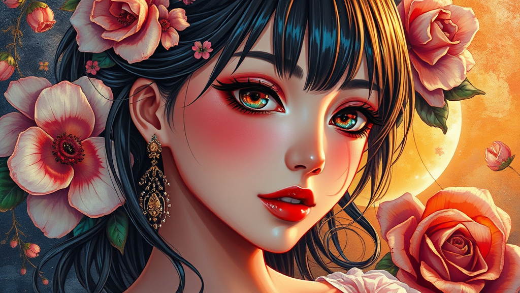 Thick acrylic illustration, stunning anime girl, oil painting style, vivid iridescent reflections, embellished with floral motifs, dramatic chiaroscuro lighting, divine cinematic rim illumination, inspired by rococo art, aspect ratio 2:3.
