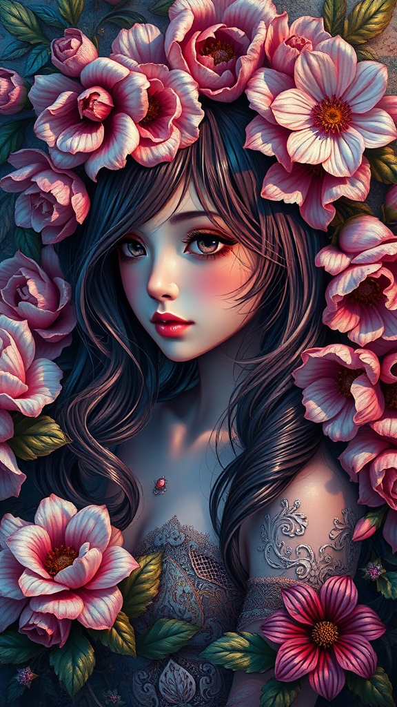 Thick acrylic painting depicting a stunning anime girl amidst lavish oil textures, adorned with intricate flower decorations, showcasing a mesmerizing play of extreme iridescent reflections. Featuring dynamic chiaroscuro contrasts, the piece is accentuated by divine cinematic rim lighting, evoking the grandeur of rococo art, all captured in a captivating 2:3 aspect ratio composition.