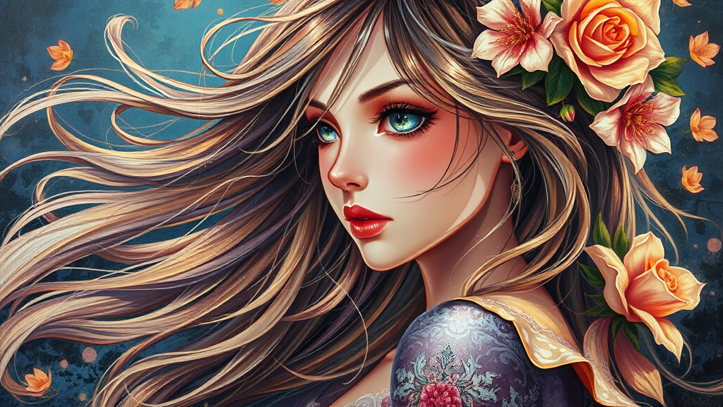 Thick acrylic painting, stunning anime girl with flowing hair, oil paint texture, vibrant iridescent highlights, adorned with delicate floral motifs, dramatic chiaroscuro, divine cinematic backlighting, baroque art influences βar 2:3.