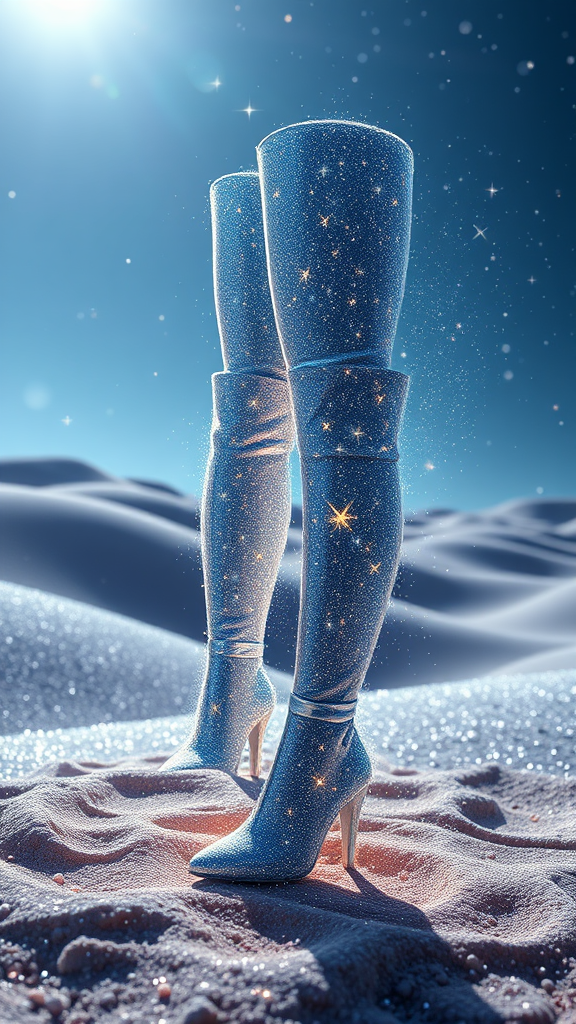 Thigh-high boots crafted from ethereal cosmic dust gently dissipate into the atmosphere, set against rolling hills of shimmering stardust that sparkle under a celestial sky. The scene exudes a heavenly, otherworldly ambiance, captured in stunning 8k UHD with photorealistic hyperrealism. Dramatic lighting enhances the intricate details, while bokeh effects add depth to the photography. The image portrays a realistic yet fantastical vision with sharp focus and high detail. Advanced raytracing and physics-based rendering techniques, using nfixer, nartfixer, and nrealfixer, bring the scene to life in CGI and 3D. The final artwork, rendered in Octane, presents a flawless visual narrative with no low-resolution issues, pixelation, or out-of-focus elements.