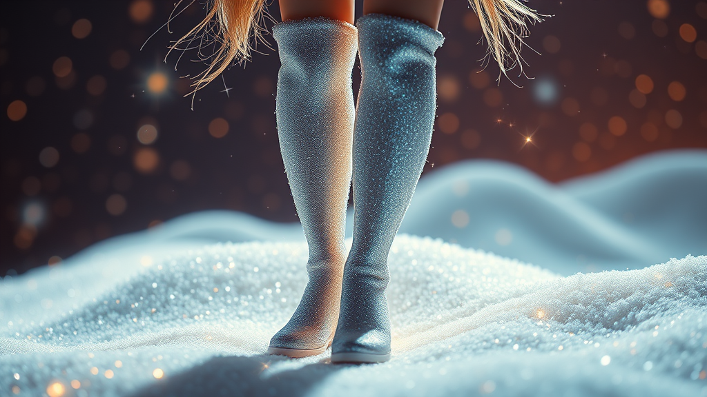 Thigh-high boots woven from ethereal cosmic dust, gently dissipating, against hills crafted from shimmering stardust, evoking a heavenly and celestial atmosphere with an extraordinary feel. Captured in stunning 8k ultra-high-definition, these photorealistic images boast hyperrealism, dramatic lighting, and a mesmerizing bokeh effect. Each photograph is realistic with a sharp focus, highlighting highly detailed and intricate elements, employing advanced techniques like raytracing and physics-based rendering for a lifelike appearance. Created using cgi and 3d artistry, the scene includes elements reminiscent of fine doll craftsmanship. Rendered using octane for exceptional clarity, with intentional artistic choices like low resolution, text presence, cropping, and visible jpeg artifacts to enhance the ethereal quality, while parts remain tastefully out of focus for a dreamlike impact.