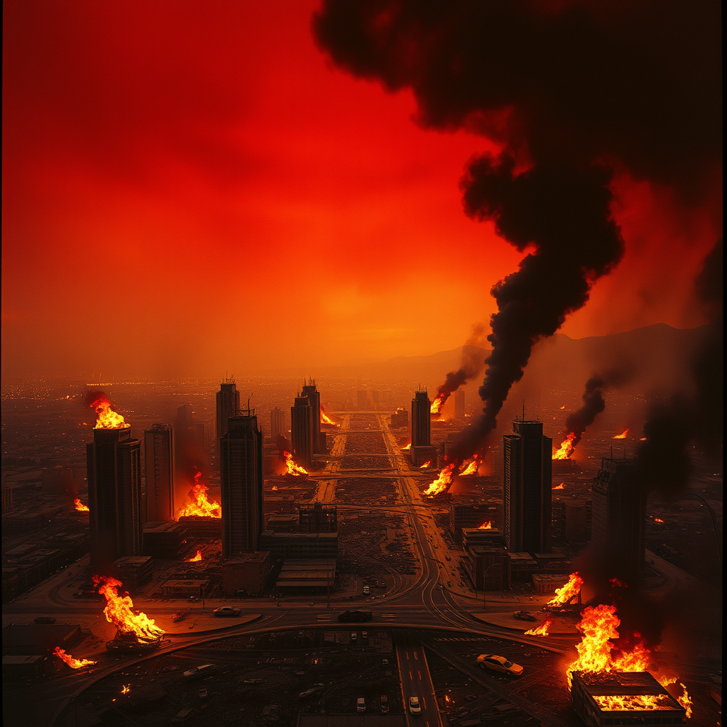 This 70mm cinematic portrait depicts a haunting, post-apocalyptic landscape with the shattered remnants of Los Angeles sprawling into the horizon. Flames rage across the cityscape, as burning vehicles and collapsing skyscrapers contribute to the chaotic destruction. The sky is an ominous shade of crimson, with thick, swirling black smoke rising from the smoldering ruins. The image is captured in stunning detail, featuring a rich film grain and tactile texture that enhances its cinematic ambiance. The color palette is predominantly dark and subdued, punctuated by vivid bursts of fiery hues, which heighten the drama and urgency of the scene. The overall effect is one of gritty, high-stakes action, exuding a palpable sense of tension that captivates and immerses the viewer in the unfolding catastrophe.