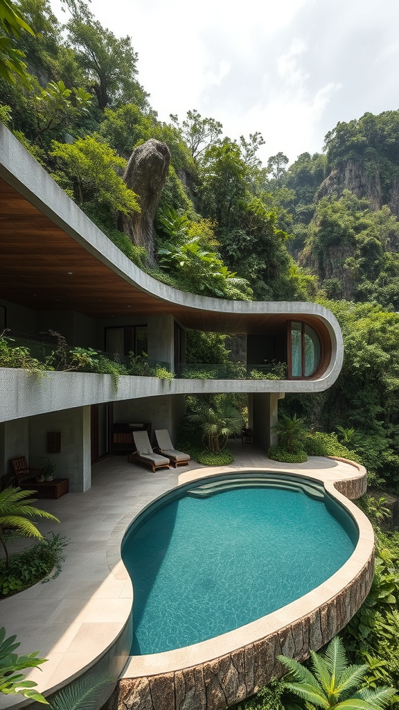 This abode forms part of a collection of jungle residences crafted to integrate effortlessly with their natural surroundings, emulating the organic shapes of the cliffs to achieve harmony with the verdant subtropical landscape. Constructed using raw concrete, stainless steel, and rich timber, the materials enhance the greenery while forging a tactile link to the environment. Rounded elements, like the recessed conversation nook and the oval pool, mirror the mountain's curves, while expansive, flowing apertures welcome nature into the interior spaces. The design prioritizes openness and fluidity, immersing occupants in the jungle's untamed beauty while offering an atmosphere of elegance and tranquility.
