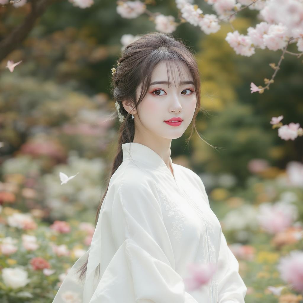This artwork beautifully portrays the essence of elegance in a young Asian woman, highlighting her natural grace and charm. It is an awe-inspiring masterpiece, capturing the wonder and beauty of the surrounding world. The image focuses on her serene expression and poised demeanor, emphasizing harmony and tranquility.