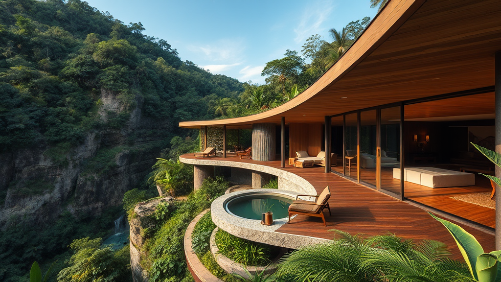 This dwelling is part of a collection of jungle residences crafted to harmonize effortlessly with their verdant environment, mirroring the cliff's organic shapes to achieve unity with the lush tropical terrain. Constructed with rough-hewn concrete, brushed metal, and rich timber, the materials enhance the surrounding foliage while establishing a tangible bond with the natural world. Soft contours, like the sunken lounge area and the circular water feature, reflect the mountain's outlines, while expansive, curving apertures invite the outdoors into the interior spaces. The design prioritizes openness and seamless flow, immersing inhabitants in the jungle's untamed splendor while delivering a sophisticated sense of comfort and refuge.