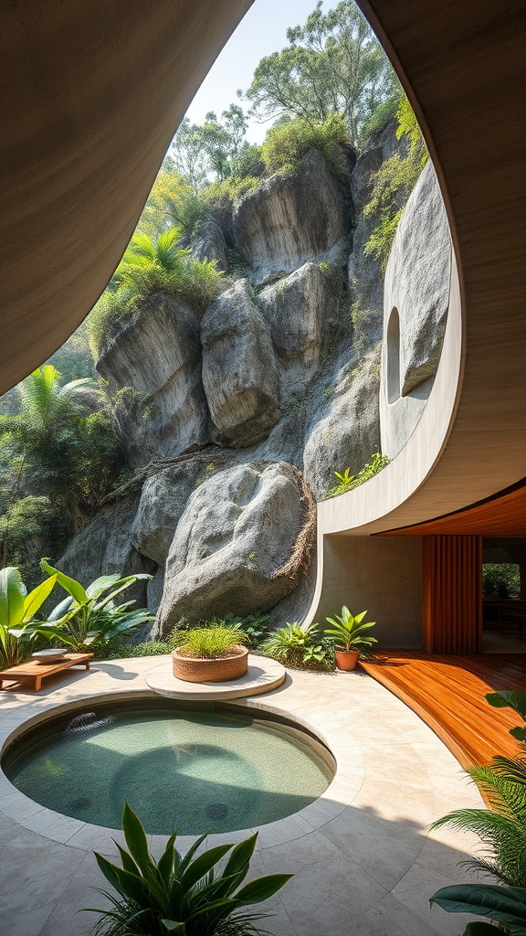 This dwelling is part of a series of jungle residences crafted to blend effortlessly with their botanical surroundings, emulating the natural forms of the cliffs to achieve harmony with the vibrant subtropical environment. Constructed using raw concrete, polished steel, and rich timber, the materials enhance the lush greenery while establishing a sensory connection to the natural world. Soft, rounded shapes such as the sunken lounge area and the circular water feature mirror the mountain's contours, while expansive, sweeping openings invite the outdoors into the interior spaces. The design focuses on openness and flow, enveloping residents in the jungle's unrefined beauty while delivering a sense of comfort and elegance.