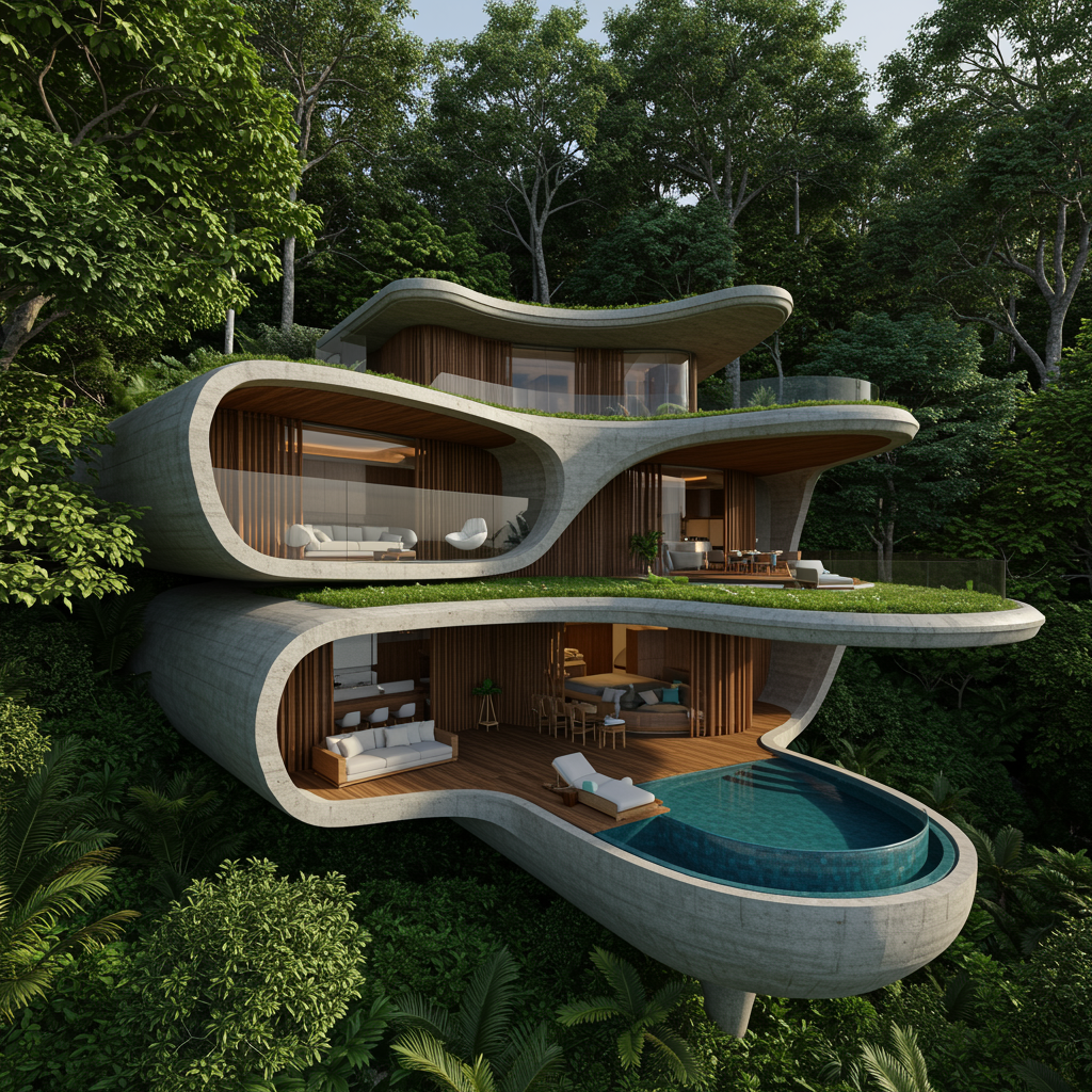 This house is one of a unique collection of jungle dwellings crafted to seamlessly integrate with their natural surroundings, emulating the fluid forms of the cliff to create harmony with the vibrant subtropical landscape. Constructed from raw concrete, polished stainless steel, and rich timber, the materials enhance the greenery while encouraging a tactile bond with the environment. Organic shapes, such as the recessed conversation nook and the crescent-shaped pool, mirror the mountain's contours, while expansive, curving apertures invite nature into the living areas. The design prioritizes openness and fluidity, enveloping the occupants in the jungle's untamed beauty while offering a sense of luxury and tranquility.