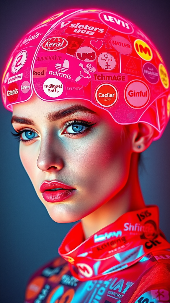 This image depicts a striking portrayal of a stylized brain designed to resemble a mosaic filled with transparent logos from various sectors such as automotive, food, fashion, technology, beverage, computing, and publishing. These logos are artfully distributed across the brain, seamlessly integrated into the design. The brain is bathed in a vibrant neon hue that stands out against the individual's fair complexion. The subject, with sharply defined facial features such as a strong jawline, prominent cheekbones, and deep-set eyes, is adorned in clothing that mirrors the neon aesthetic of the brain's intricate patterns. Her gaze is directed slightly away from the viewer, imbuing the scene with a sense of contemplation or introspection. This artistic piece serves as a representation of contemporary fashion blended with elements of consumer culture, crafted for a high-fashion editorial setting.