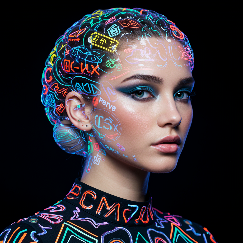 This image features a highly stylized brain design, filled with transparent logos from car, food, clothing, technology, beverage, computer, and publishing brands. The logos are seamlessly integrated throughout the brain, which is depicted in vivid neon hues that starkly contrast with the individual's fair skin tone. The person possesses defined facial features, including a strong jawline, prominent cheekbones, and deep-set eyes, wearing attire adorned with neon designs that echo the neon theme of the brain. Her gaze is slightly off-screen, adding an introspective mood to the image. This artistic fashion piece represents a fusion of contemporary style and customer experience, designed for a haute couture editorial.