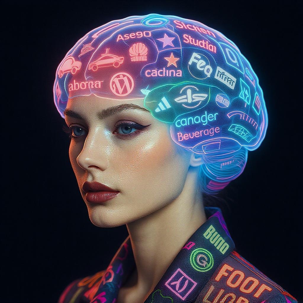 This image presents a striking and stylized depiction of a brain intricately filled with transparent logos from various car, food, clothing, technology, beverage, computer, and publishing brands. The logos are seamlessly integrated throughout the brain, creating a unified, elaborate design that glows in a vibrant neon hue. This neon atmosphere contrasts elegantly with the individual's light complexion, further emphasized by her well-defined facial features, including a strong jawline, prominent cheekbones, and deep-set eyes. She wears garments adorned with neon patterns that mirror the brain's luminous theme, reinforcing a cohesive visual aesthetic. The subject's gaze is focused slightly off-screen, imparting a sense of contemplation or introspection. This brain motif symbolizes a harmonious blend of contemporary high fashion and consumer culture, crafted for an avant-garde haute couture editorial.