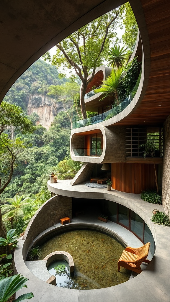 This residence is part of a collection of jungle dwellings crafted to seamlessly integrate with their natural environment, mirroring the organic shapes of the cliff to achieve harmony with the verdant subtropical landscape. Constructed with raw concrete, sleek stainless steel, and rich timber, the materials enhance the greenery while cultivating a sensory connection to the surroundings. Curvilinear elements, such as the sunken lounge area and the circular water feature, reflect the mountain's contours, while expansive, sweeping openings draw nature into the living spaces. The design focuses on openness and fluidity, immersing residents in the jungle's untamed beauty while offering an experience of comfort and refined elegance.