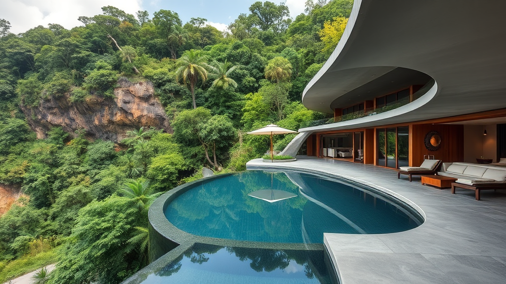 This residence is part of a collection of jungle dwellings crafted to merge effortlessly with their verdant surroundings, emulating the natural shapes of the cliff to establish harmony with the vibrant subtropical landscape. Constructed using exposed concrete, brushed steel, and rich timber, these materials harmonize with the greenery while encouraging a tactile connection to the environment. Rounded features, such as the sunken lounge area and the elliptical pool, mirror the mountain's curves, while expansive, flowing openings draw the natural world into the living areas. The design emphasizes transparency and fluidity, enveloping the inhabitants in the jungle's pristine beauty while offering an experience of elegance and comfort.
