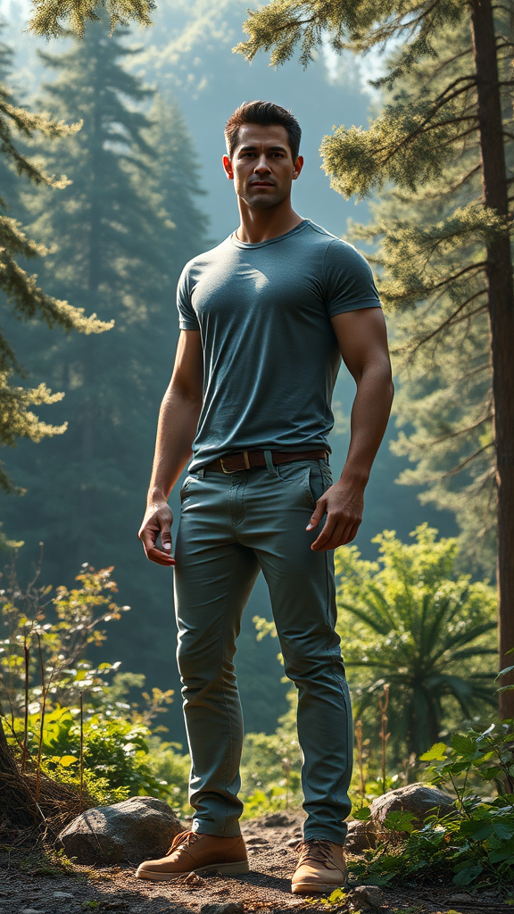 This scene depicts a muscular adult male anthro figure standing confidently amidst a lush wilderness setting, wearing fitted pants and a casual t-shirt. The backdrop features a mesmerizingly detailed landscape of dense forest, towering trees, and dappled sunlight filtering through the leaves, conveying a sense of both adventure and tranquility. The visual portrayal is photorealistic, capturing every nuance with ultra-detailed precision, painting a vivid picture of nature's beauty and the character's serene connection to this unspoiled environment.