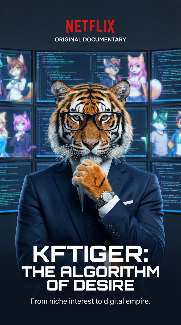Netflix Original Documentary poster for "KFTIGER: The Algorithm of Desire". A photorealistic tiger head, wearing black-rimmed glasses, is centered on a human body in a sharp dark blue suit, white shirt, and dark blue tie. The tiger's right paw is resting on its chin in a thoughtful pose, a wristwatch visible. Behind the tiger, multiple computer monitors display lines of glowing blue and green code, with some screens showing blurred furry anime characters. The overall mood is serious and tech-focused, with a cool blue and dark gray color palette. The bottom of the poster has the tagline "From niche interest to digital empire."