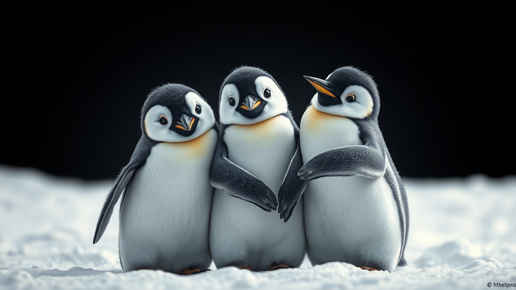 Three adorable penguins huddle together in the snowy expanse capturing a playful selfie, depicted in a style reminiscent of b-movie charm and hyperrealism. The scene is crafted with hyper-realistic attention to avian details, employing photo-realistic techniques that bring out the intricate textures and expressions of the penguins. The composition is bathed in soft light yellow hues contrasting with dark silver tones, evoking a captivating documentary photograph. The artistry subtly nods to the Quito school's influence, blending traditional and modern elements in an atmospheric 9:8 aspect ratio, inviting viewers into the penguins' whimsical world.