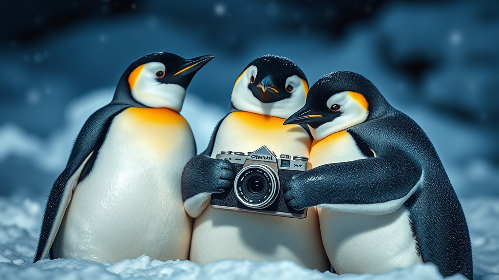 Three adorable penguins huddled together in a snowy landscape, capturing a selfie moment with an old-fashioned camera. The scene is infused with B-movie aesthetics, showcasing hyper-realistic details reminiscent of meticulous bird studies. The penguins' feathers glisten with light yellow highlights against a backdrop of dark silver shadows, creating an intriguing juxtaposition. The photograph exudes a captivating documentary style, drawing inspiration from the Quito School's artistic approach. The crisp details and nuanced textures give the image a photo-realistic quality, capturing the playful essence of these charming creatures.