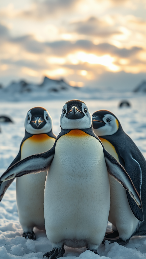 Three adorable penguins in the snow capturing a selfie, evoking b-movie aesthetics with a touch of hyperrealism and hyper-realistic bird studies, employing photo-realistic techniques with a palette of light yellow and dark silver hues; reminiscent of captivating documentary photography, inspired by the Quito School, highlighting their playful antics and shimmering feathers against a snowy backdrop under a dramatic sky, with subtle tweaks in the composition to enhance storytelling and visual depth.