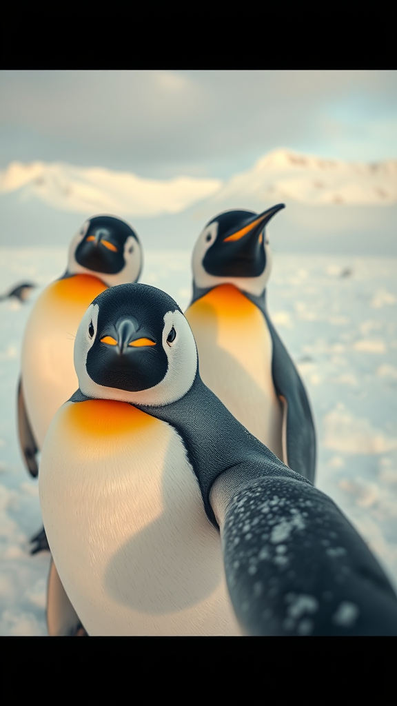 Three adorable penguins in the snowy landscape capturing a selfie, depicted in vintage b-movie style with hyperrealism, showcasing hyper-realistic avian studies, using photo-realistic techniques with hues of light yellow and dark silver; the scene reminiscent of captivating documentary photography, akin to the Quito school art style, maintaining an aspect ratio of 9:8 with an intricate level of detail and sophistication.